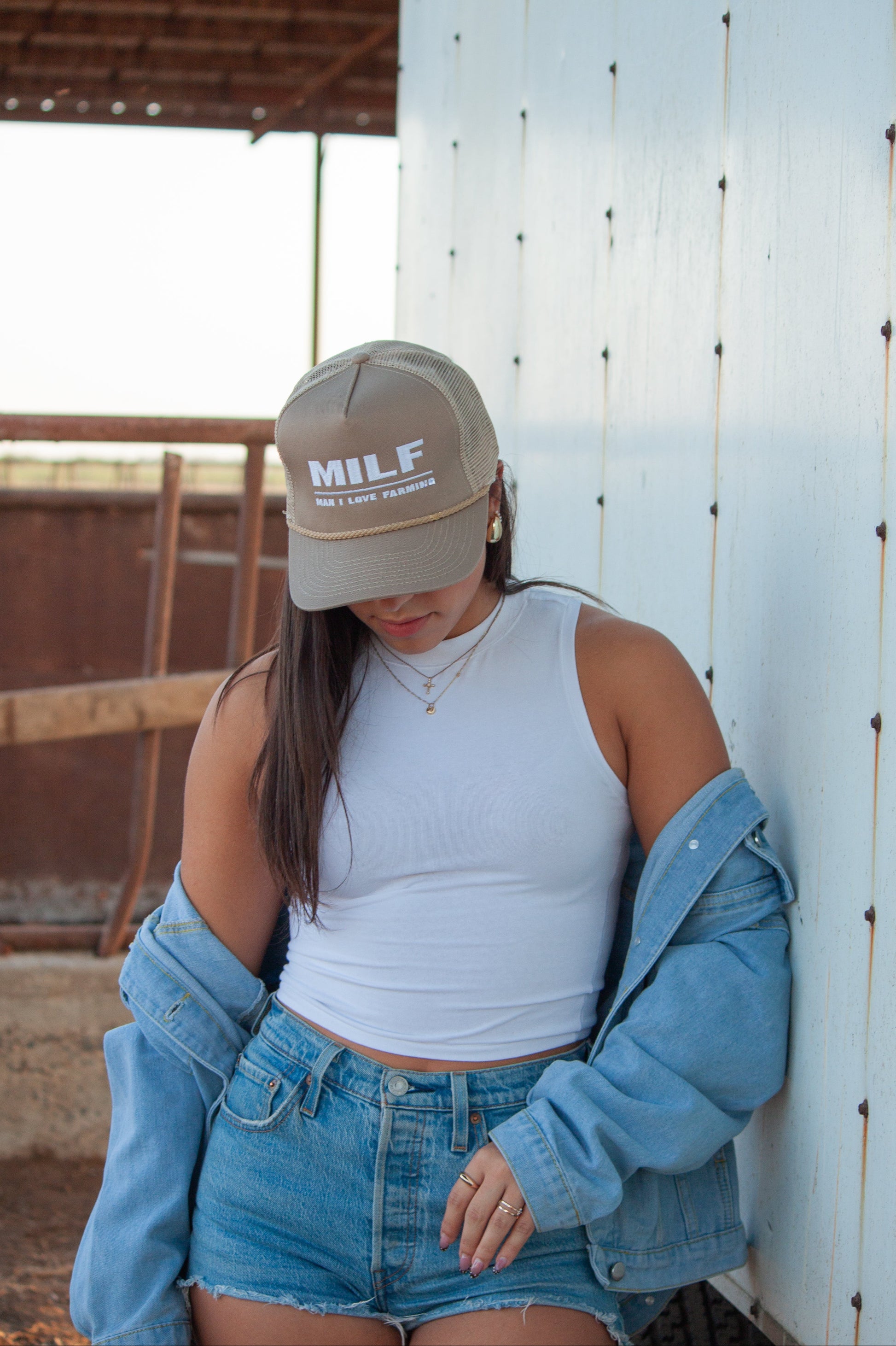 Man I Love...Farming! Embroidered Cotton Trucker Hat with our signature MILF logo and khaki rope accent.