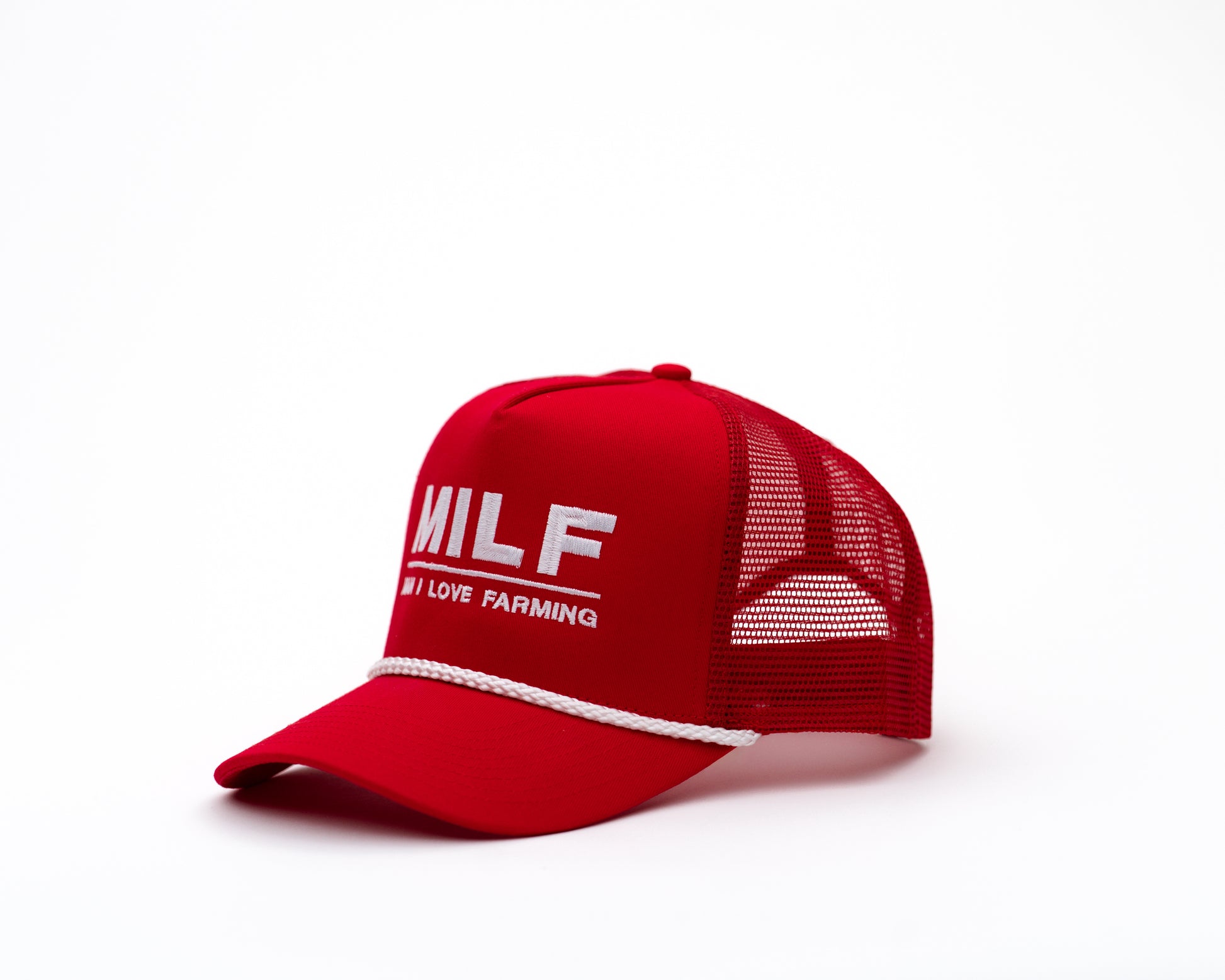 Man I Love...Farming! Embroidered Cotton Trucker Hat with our signature MILF logo and white rope accent.